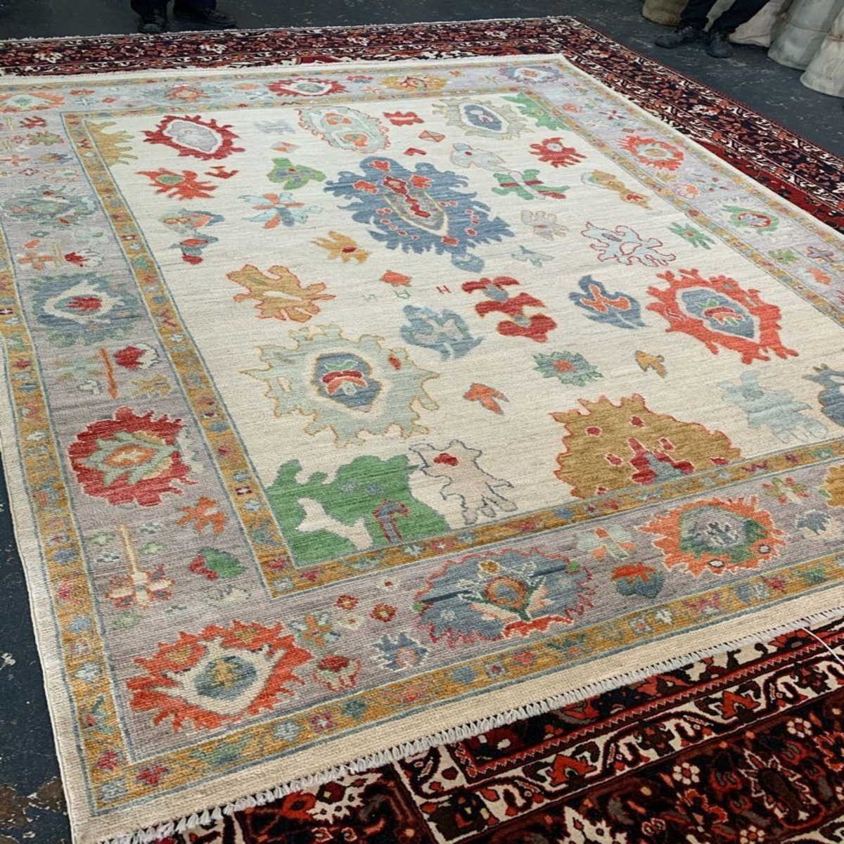 Authentic Oushak rug hand knotted using traditional techniques, offering superior quality and comfort.