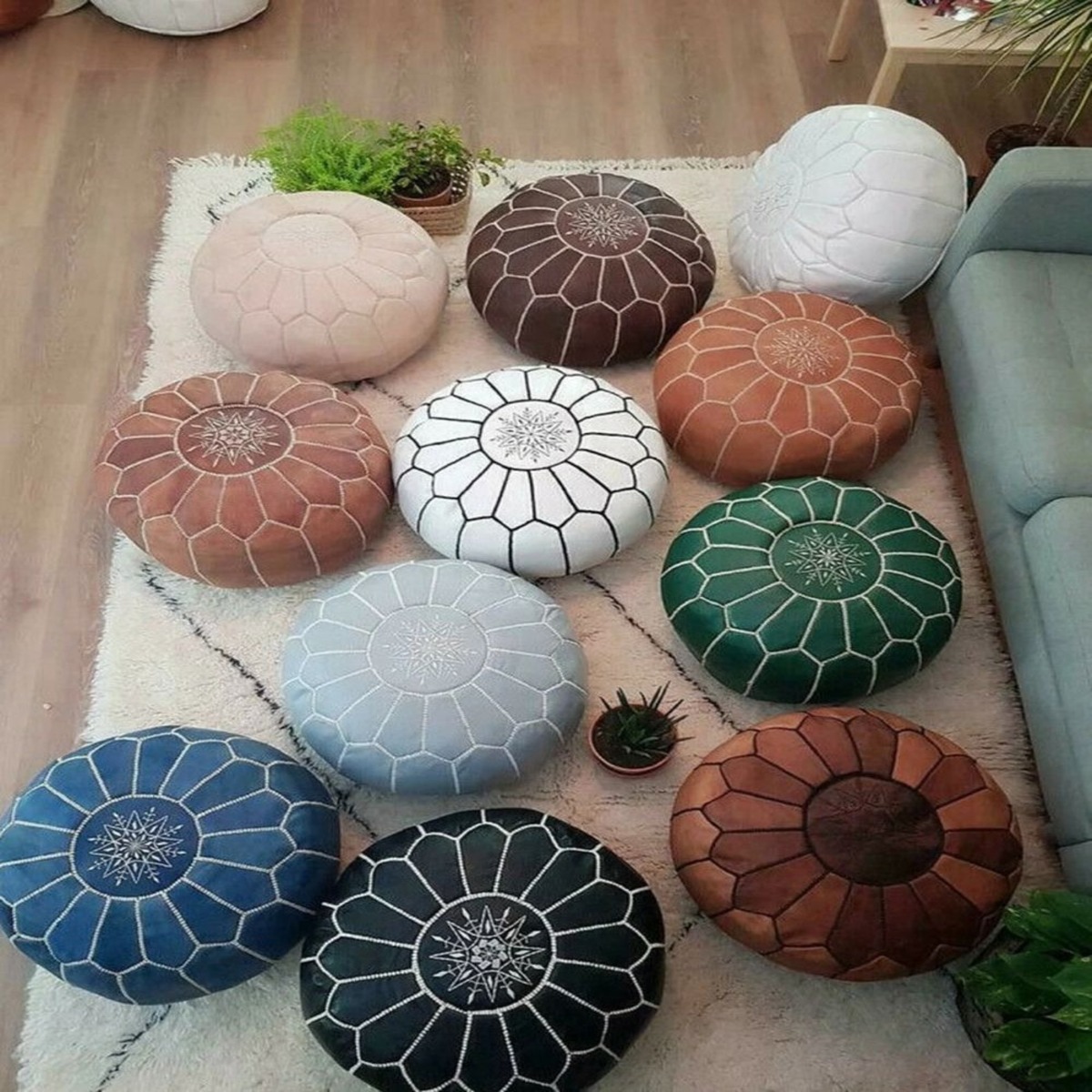 Round Leather Pouf — Softly structured design perfect as a footrest or casual seating.